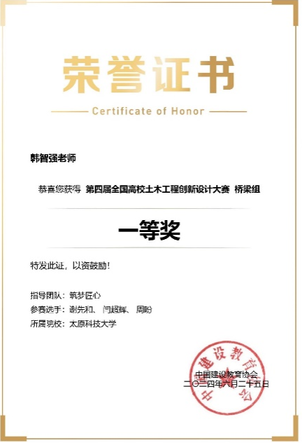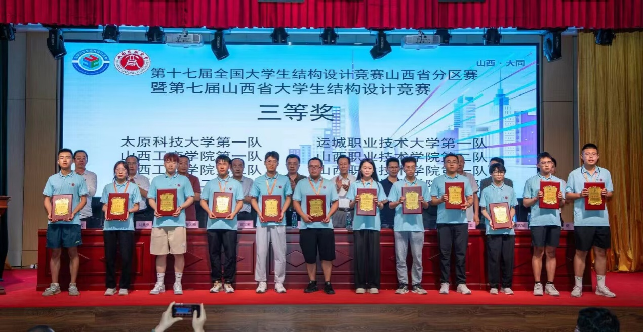 2024年7月12日~7月15日,第七届山西省大学生结构设计竞赛在大同开赛。该项竞赛由山西省高等学校土木与建筑类专业教学指导委员会指导,山西省土木建筑学会、山西大同大学共同主办,山西省土木建筑学会土木工程学科竞赛委员会和山西大同大学建筑与测绘工程学会共同承办。经过激烈角逐,最终有53件作品获奖,我院韩智强老师指导的本科生团队作品荣获省三等奖。