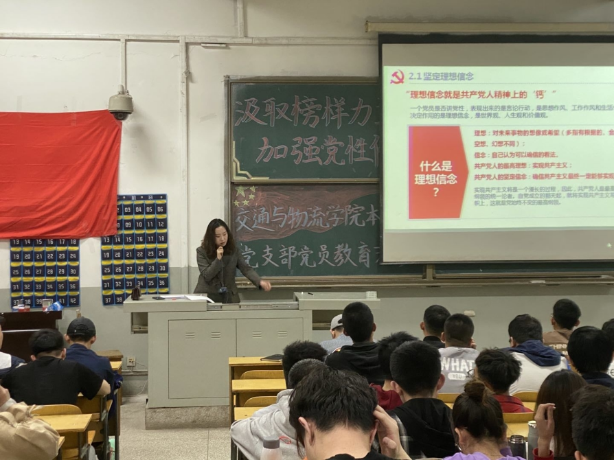 2021年4月29日,交通与物流学院本科生第一党支部支部书记杜婧,在18楼5阶为本科生第一党支部和本科生第二党支部的全体学生,上了一堂“汲取榜样力量,加强党性修养”的专题党课。