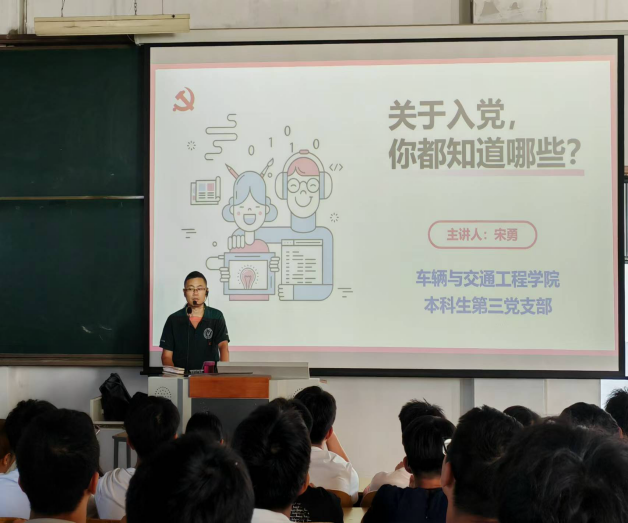 本科生第三党支部书记宋勇老师就入党条件、入党动机、党的基本理论等方面展开讲解。他讲到,生逢强世,青年既面临着难得的建功立业的人生际遇,也肩负着“天将降大任于斯人”的时代使命。青年学子也应当点燃自己理想信念的“火种”,深耕厚植爱党、爱国、爱社会主义情感,积极主动保党、信党、入党,铸就伟大的马克思主义信仰,以实现中华民族伟大复兴为己任。