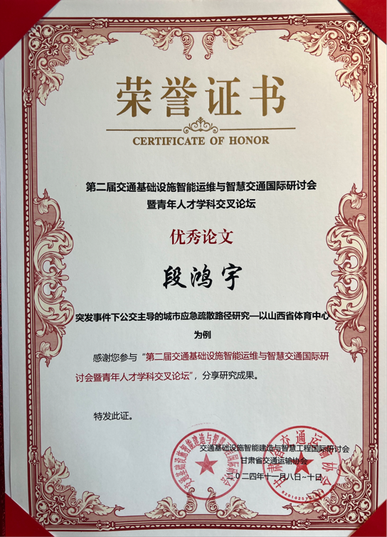我院研究生段鸿宇参加会议并作分组报告,其交流论文“突发事件下公交主导的城市应急疏散路径研究”被评为优秀论文。